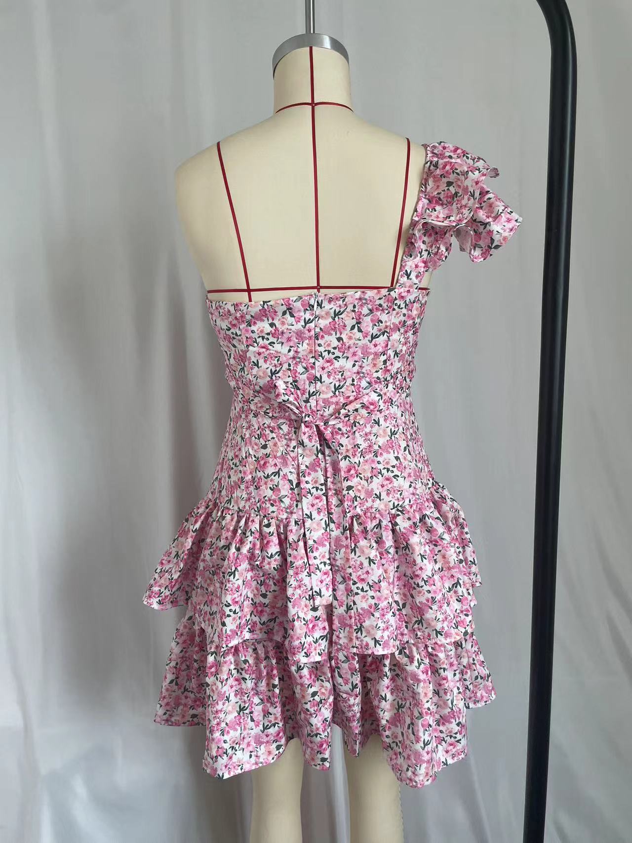 A one-shoulder, flappy, waist-exposed, sexy and fashionable pink lace-up floral dress for a hot girl