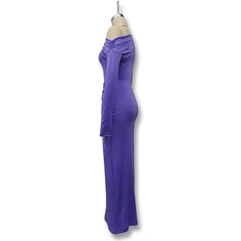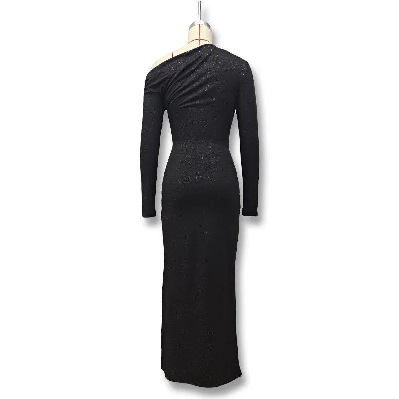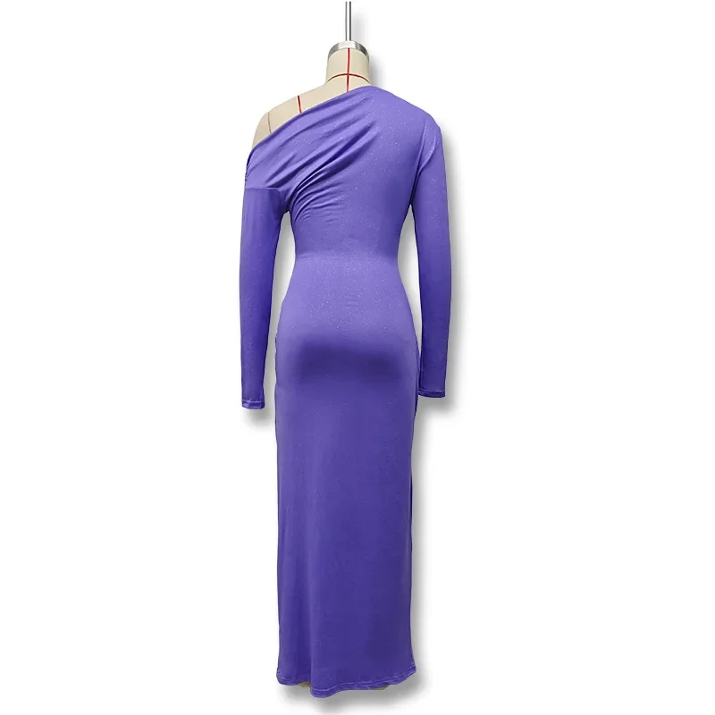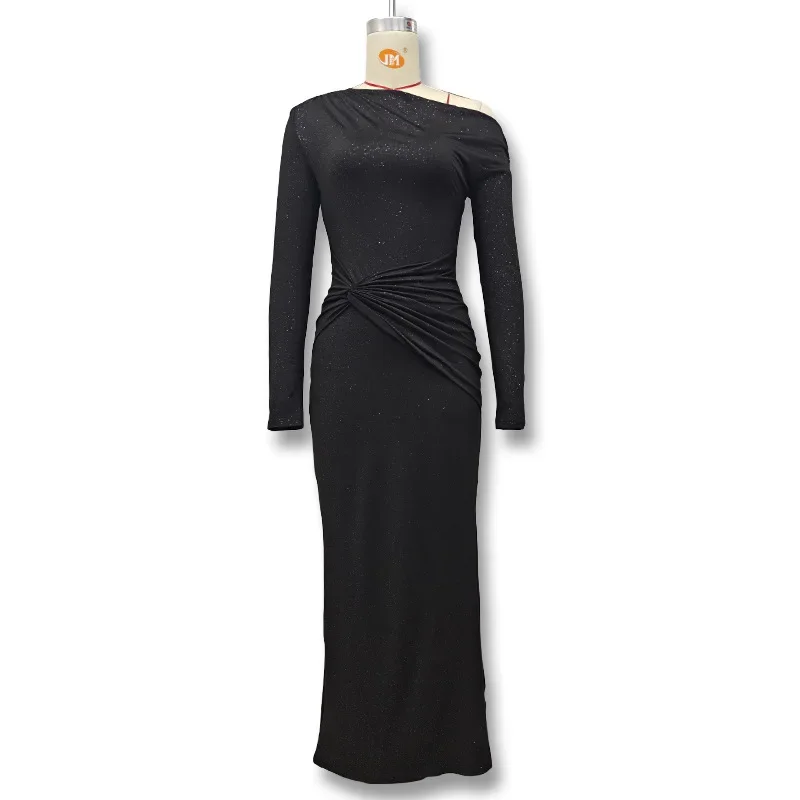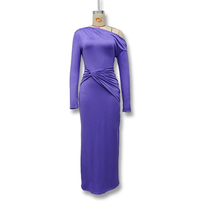 European and American style cross-border autumn and winter new hot-selling slant shoulder long sleeve hip dress fashion sexy pleated slim dress