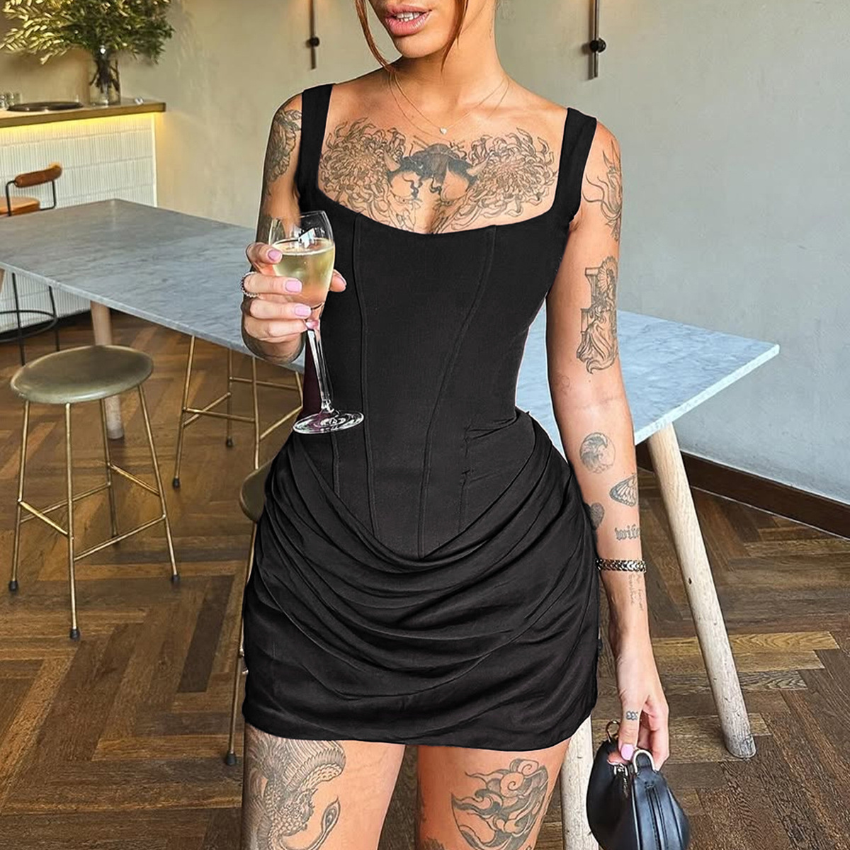 Style: Tight fit, suspender dress, sleeveless, low collar, high waist