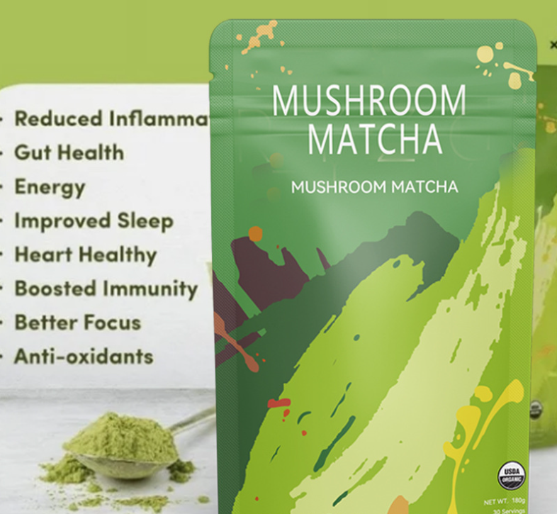 Packaging Variants: Mushroom coffee, mushroom matcha, mushroom chicory, mushroom hot cocoa, probiotic creamer with mushrooms.