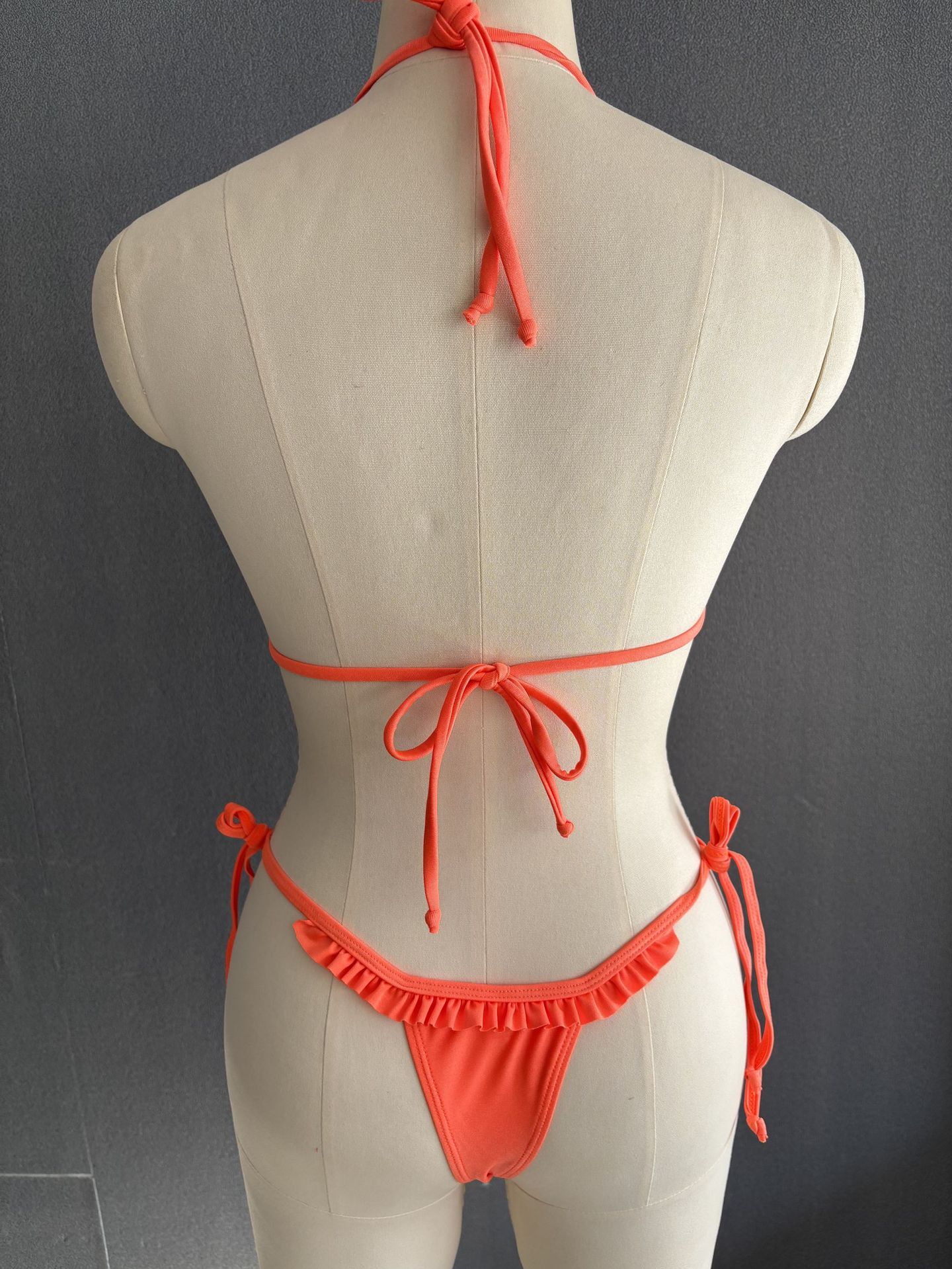 Style: Bikini with ruffled edges, backless, and sleeveless.