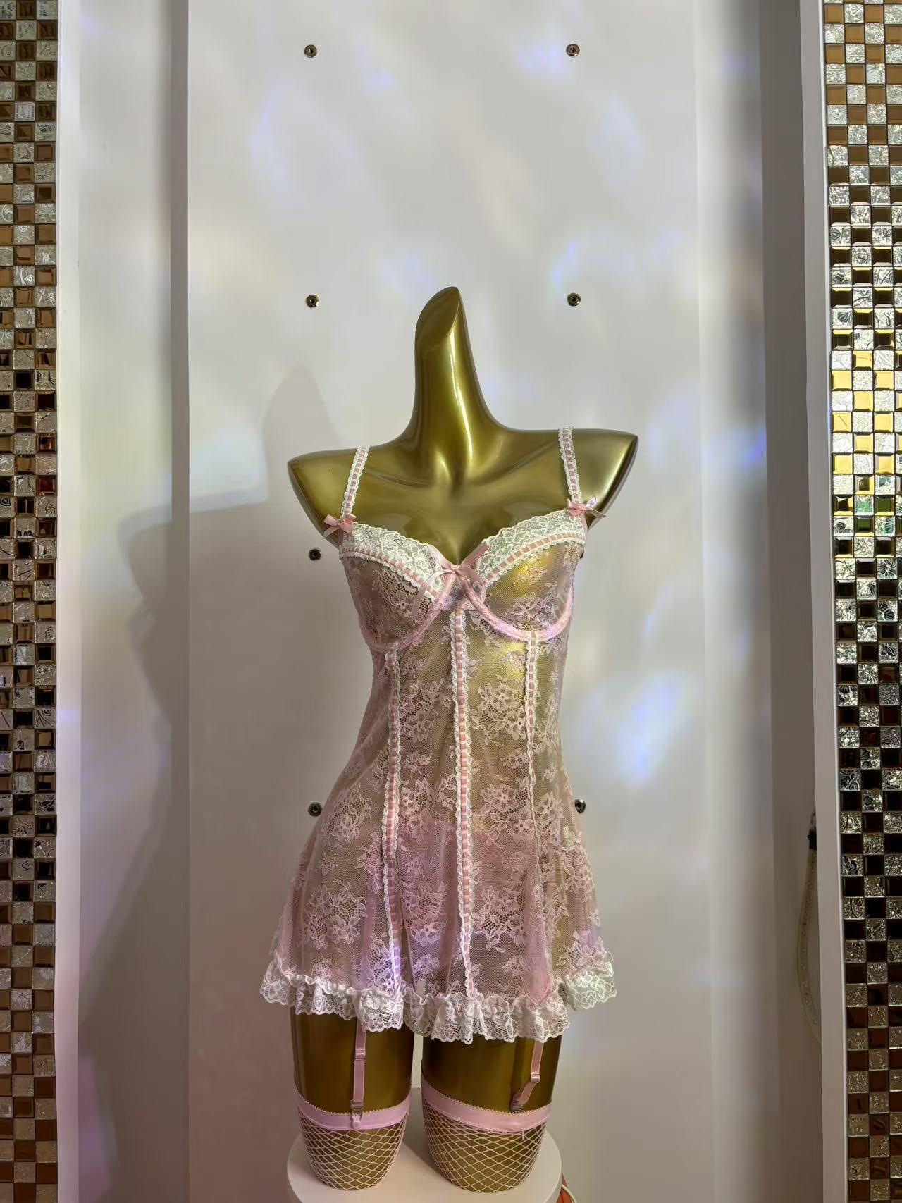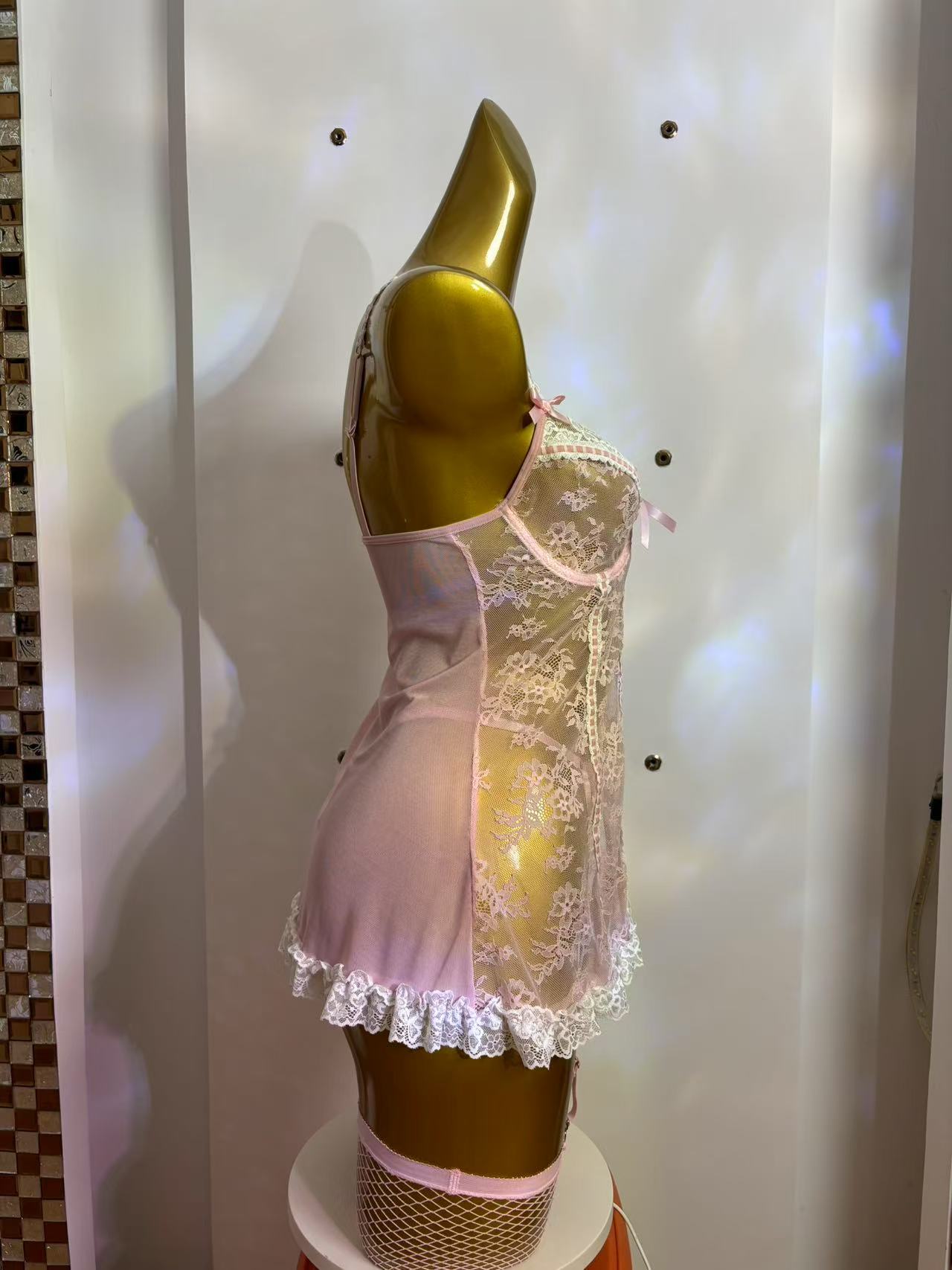 Style: One-piece skirt with fishnet stockings.
