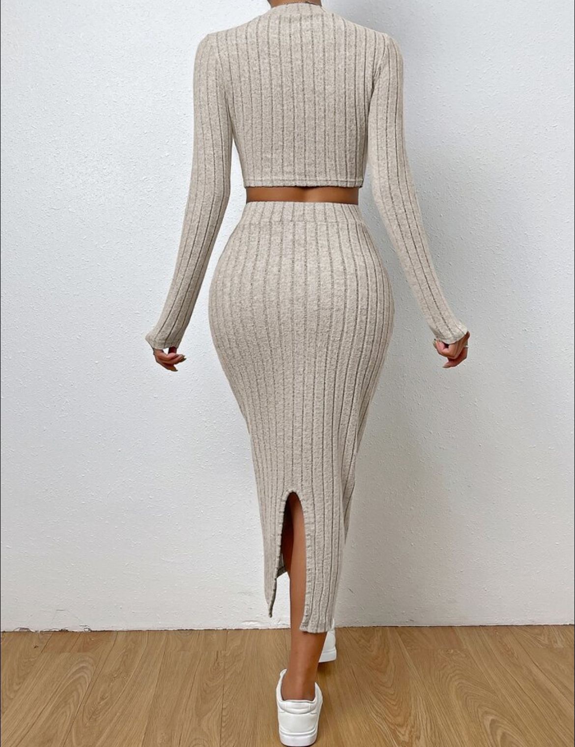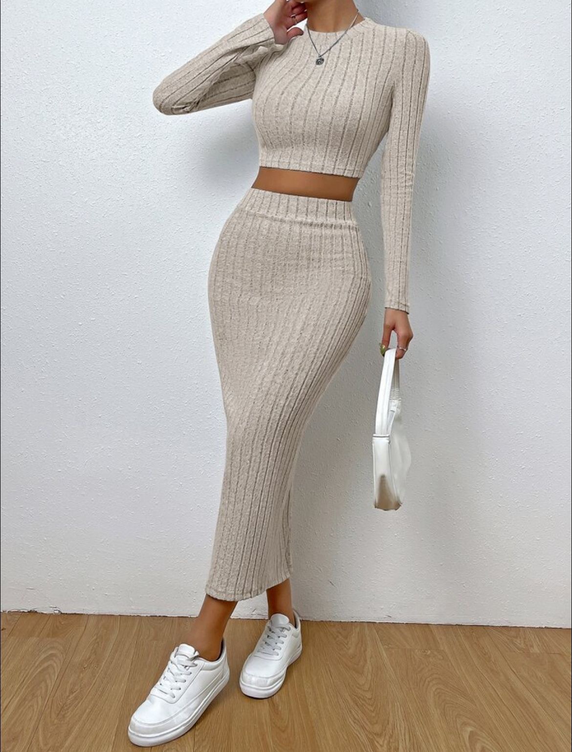 Stylish Design: Fashionable round neck and long-sleeved knitted suit with a hip-hugging skirt, perfect for a trendy look.
